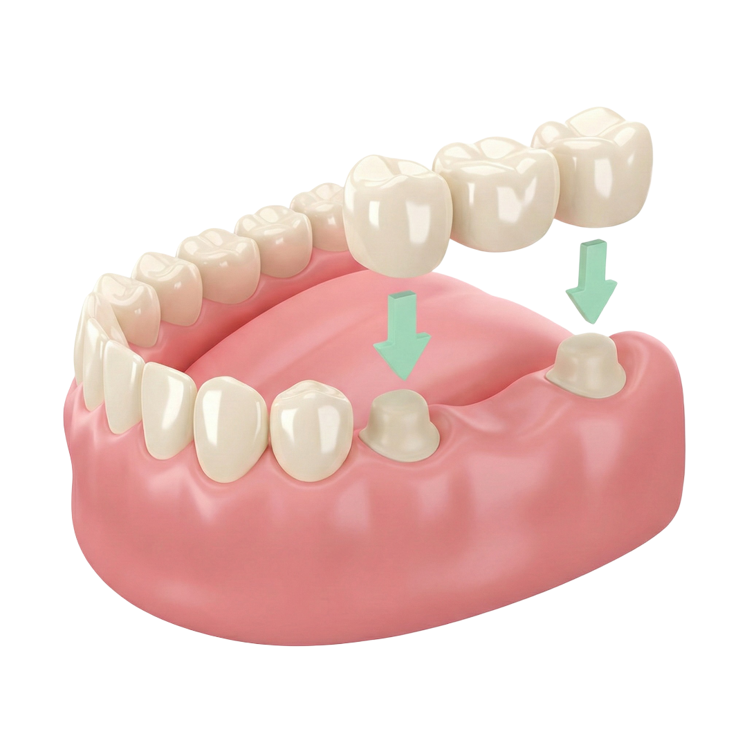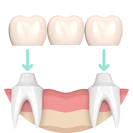 A bridge is a dental restoration used to replace one or more missing teeth by anchoring onto the adjacent teeth. The teeth on either side of the gap are trimmed, and the bridge is permanently cemented in place. Compared to dentures, bridges are more comfortable and are usually more affordable than dental implants.